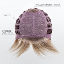 Java by Ellen Wille is a sophisticated, chin-length bob wig with a perfect cut nape.  Side-swept fringe and layers gives this asymmetrical cut a classy look shown in colour cholocate rooted. The hand knotted lace front gives an amazing natural look for the off the face styling versatility. The open wefted cap is designed to allow air to flow through, keeping your wig light and cool all day. The cap is crafted from breathable materials selected for their softness for maximum comfort. The velvet lined ear tabs contain a wire that bends to conform to the shape of your temples.This wig is secured by smooth velcro straps which adjust up to one one inch (2.5cm) in either direction to achieve a more comfortable and secure fit. The synthetic fiber retains its style even through washing.